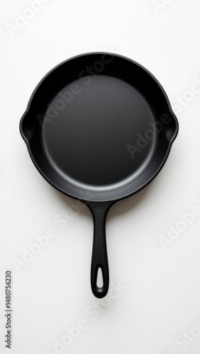 Cast iron skillet with black handle on white background with diagonal gray stripe.