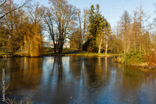 Castle Park and Telc Castle. View of the city of Telc in the winter sunset. The picturesque castle and the historic center with the decorative facades of the houses belong to the UNESCO World Heritage