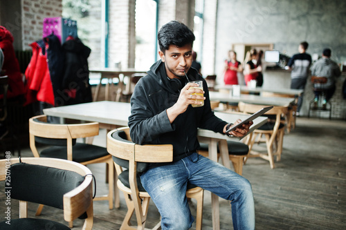 Casual and stylish young asian man with earphones at cafe drinking juice from glass and holding tablet.