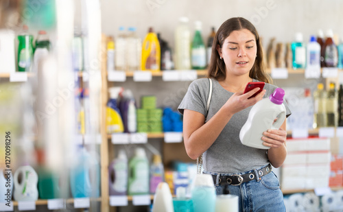 Casual modern young female shopper scanning barcode on bottle of fabric softener using phone to make mobile payment in home care products shop. Concept of technology enhancing shopping experience..