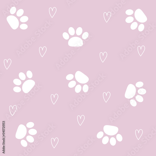 Cat dog animal paw foot print seamless pattern. Footpath footprint trail silhouette. White footprint heart set. Cute kawaii sign symbol. Flat design. Pink background. Isolated.