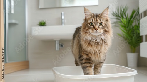 Cat Standing in Litter Box with Clean Bathroom's Modern Decor