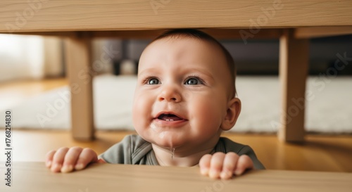 Caucasian baby playing peekaboo under wooden table