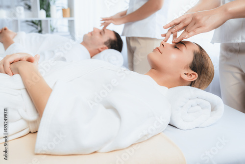 Caucasian couple enjoying relaxing anti-stress head massage and pampering facial beauty skin recreation leisure in dayspa modern light ambient at luxury resort or hotel spa salon. Quiescent