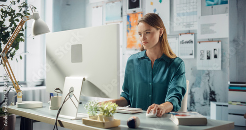 Caucasian Female Engineer Works in a Stylish Office, Using a Computer. She Wears a Teal Shirt. the Workspace Fosters Creativity, Illuminates Ideas, and Nurtures Growth With Innovative Design Elements.