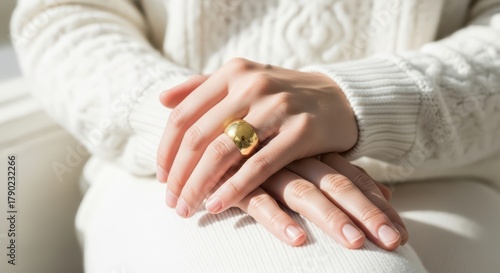 Caucasian female hands with gold ring on white sweater