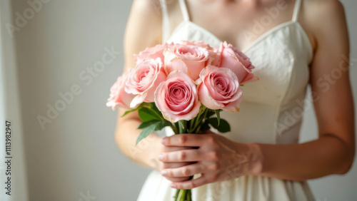 Caucasian female holding bouquet of pink roses in white dress