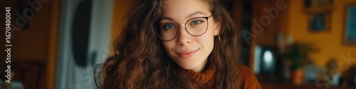 Caucasian female with curly hair and glasses in cozy home environment