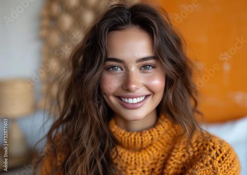 caucasian girl with colorful sweatshirt in professional colorful photo studio background