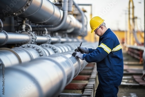 Caucasian male factory worker checks the quality of pipe connections at a gas distribution station. Gas pipeline as a means of supplying the plant with electricity and heat.