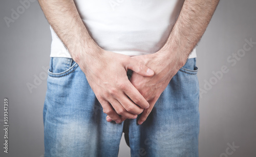 Caucasian man with hands holding his crotch. Inflammation of the prostate, erection problems