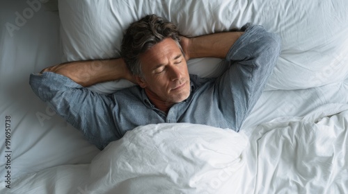 Caucasian mature male sleeping peacefully in bed with hands behind head.