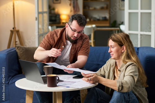 Caucasian middle aged man and Caucasian middle aged woman sitting at table reviewing financial documents and using laptop