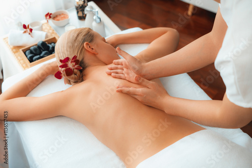 Caucasian woman customer enjoying relaxing anti-stress spa massage and pampering with beauty skin recreation leisure in day light ambient salon spa at luxury resort or hotel. Quiescent