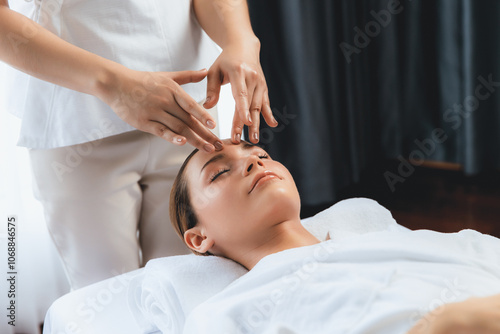 Caucasian woman enjoying relaxing anti-stress head massage and pampering facial beauty skin recreation leisure in dayspa modern light ambient at luxury resort or hotel spa salon. Quiescent