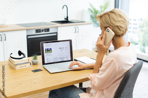 Caucasian woman using laptop and smartphone to order cosmetics online in modern kitchen. Concept of online shopping, convenience, and digital lifestyle. Emphasizing technology.