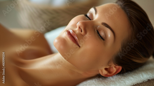 Caucasian woman's rest after spa treatments on a blurred natural background.