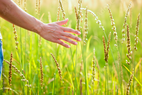 Caucasian Young Adult Man Touching Wheat Stalks in Sunlit Field