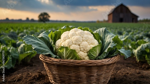 cauliflower vegetable in a wooden basket with a backgr puppy dog in outerspace