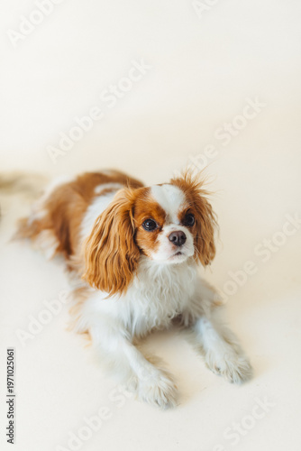 Cavalier King Charles Spaniel rests on light background in indoor space during afternoon time