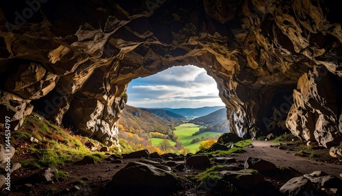 Cave opening to panoramic autumn landscape