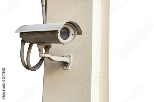 CCTV camera on wall isolated on white background.