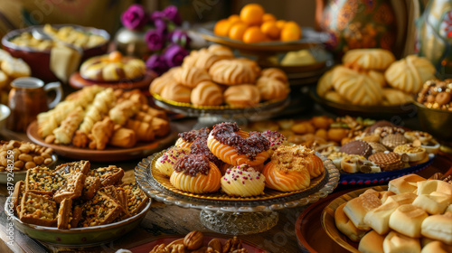 Celebrate the Azerbaijani festival of Novruz with a traditional spread featuring a variety of sweet treats like shekerbura, cookies, and nuts.