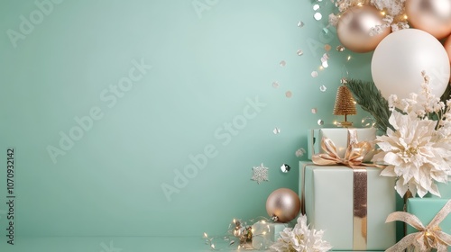 Celebrate the festive season with a Christmas and New Year banner featuring gifts, candles, ornaments, and vibrant decorations on a green background