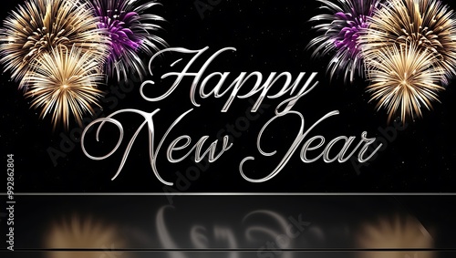 Celebrate the New Year with this elegant and festive design, perfect for capturing the excitement of the holiday. The words "Happy New Year" are written in graceful, swirling cursive.