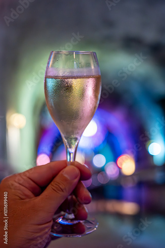 Celebration, night club with party lights and glass of champagne sparkling wine, dancing with wine, wedding event