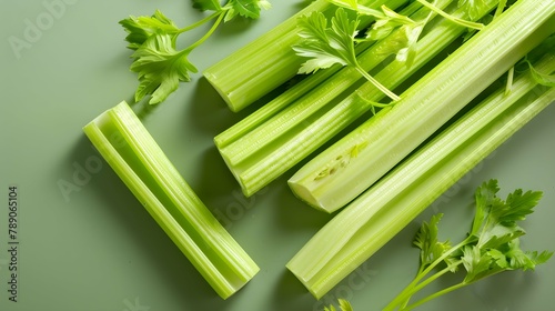 Celery sticks on a crisp green background, crunchy and refreshing green celery.