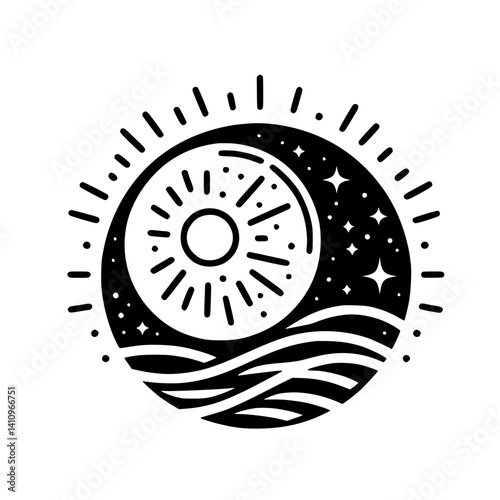 Celestial Circle: Sun, Moon, Stars, and Sea - Black & White Illustration