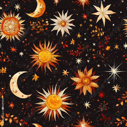 Celestial pattern, sun, moon, flowers, stars, night sky, repeat design, background, digital art, graphic . seamless pattern. repeating pattern.