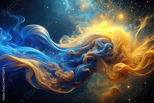 Celestial Smoke: Minimalist Blue Gold Galaxy Abstract Art - Swirling Nebula Background