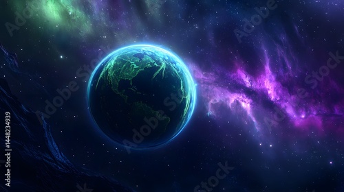 Celestial Sphere: An awe-inspiring view of Earth, shimmering amidst a tapestry of cosmic colors in the infinite expanse of the universe, offering a glimpse into the vastness of space.