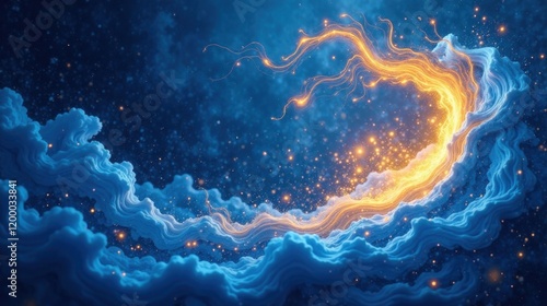 Celestial Stream A Serpentine Glow Illuminates a Dreamlike, Textured Landscape of Azure and Gold