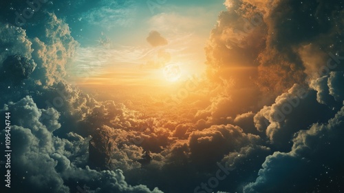 Celestial Sunset Above the Clouds: A Breathtaking Panorama of Golden Hues and Starry Nightscape