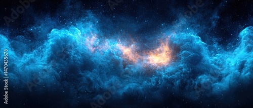 Celestial swirls of blue and orange hues, illuminated cosmic clouds, a mesmerizing interstellar panorama