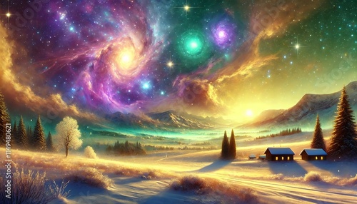 Celestial Winter Haven with Vibrant Cosmic Wonders and Ethereal Planet