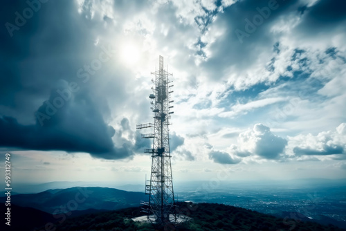 Cell phone or broadcast transmitter antenna tower with clouds background, high quality generative ai
