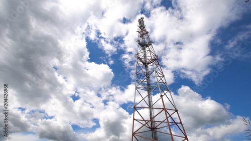 Cell phone tower against a blue sky. Tower of communications with a lot of different antennas under blue sky and clouds. Telecommunication tower with blue sky.