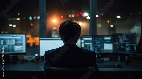 CEO oversees business operations futuristic workspace night, surrounded by multiple screens displaying data and analytics