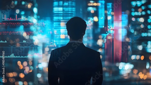 CEO Silhouette Analyzing Financial Data with Blurred City Backdrop