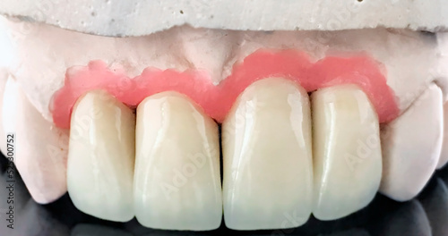 Ceramic dental bridge on plaster model. Dental prosthesis manufacturing workshop. Full wax denture. Selective focus. Dental implant. Restoration of teeth. Dental laboratory, clinic. Implants of the