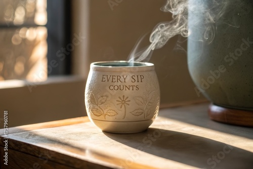 Ceramic Pot of Water with Embossed Text and Rising Steam