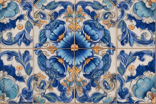 Ceramic tiles feature a blue floral design set against a pale background