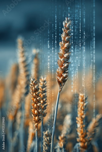 Cereals in the field, with data visualization on a digital screen overlay.