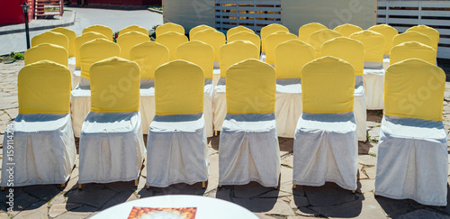 Chairs for guests on wedding ceremony with white and yellow satin cloth outdoor