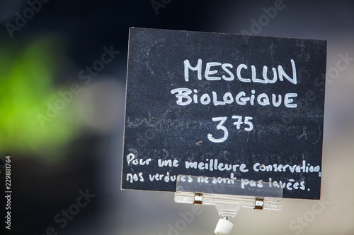 Chalk sign selling organic mesclun in a french canadian farmer's market - It also says for best conservation, these greens are not washed - Closeup picture on the sign mounted on a clip
