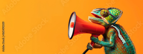 Chameleon holding megaphone, screaming and shouting on orange background with copy space